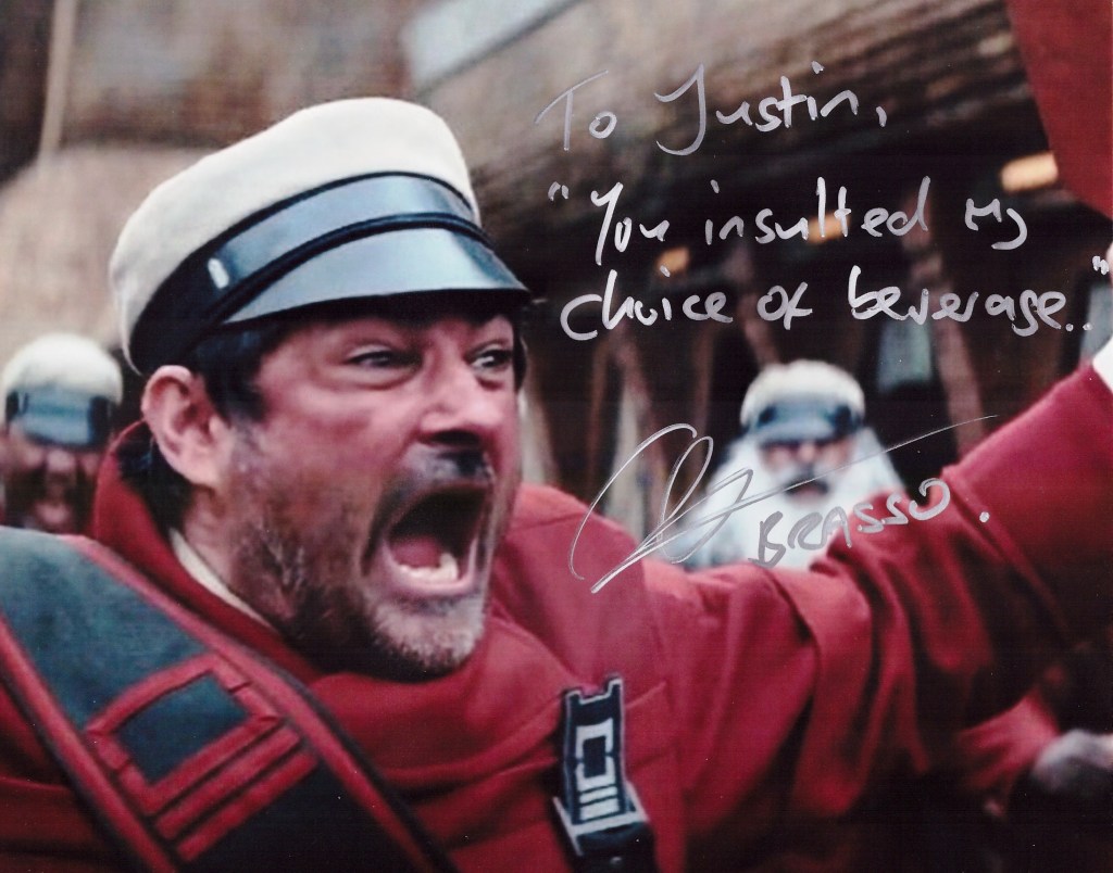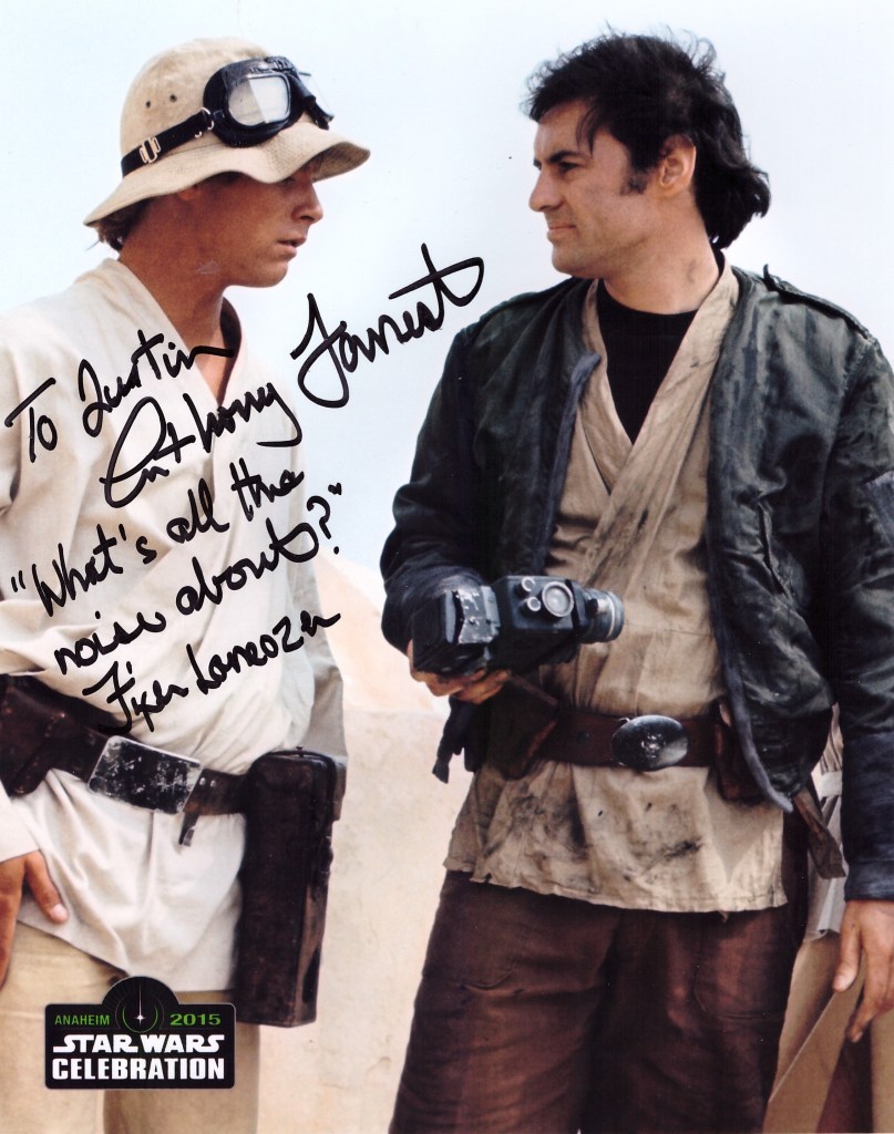 So Wedge is a favorite character. No Force powers, just a darn good pilot. He doesn’t get a lot of lines in the movies, but he does say one thing that is pretty funny. I asked him to put the quote in, and he smirked and wrote: “Look at the size of that thing!” – Dennis Lawson (Wedge)